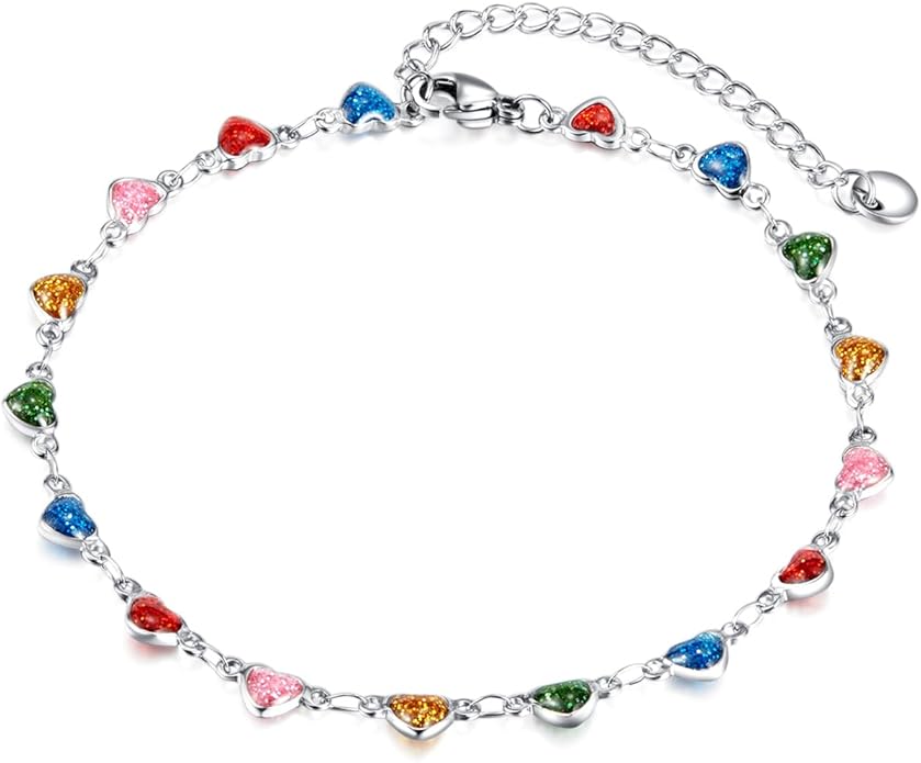 Stainless Steel Colorful Rainbow Love Heart Anklet Ankle Bracelet Foot Chain Necklace for Women Candy Color